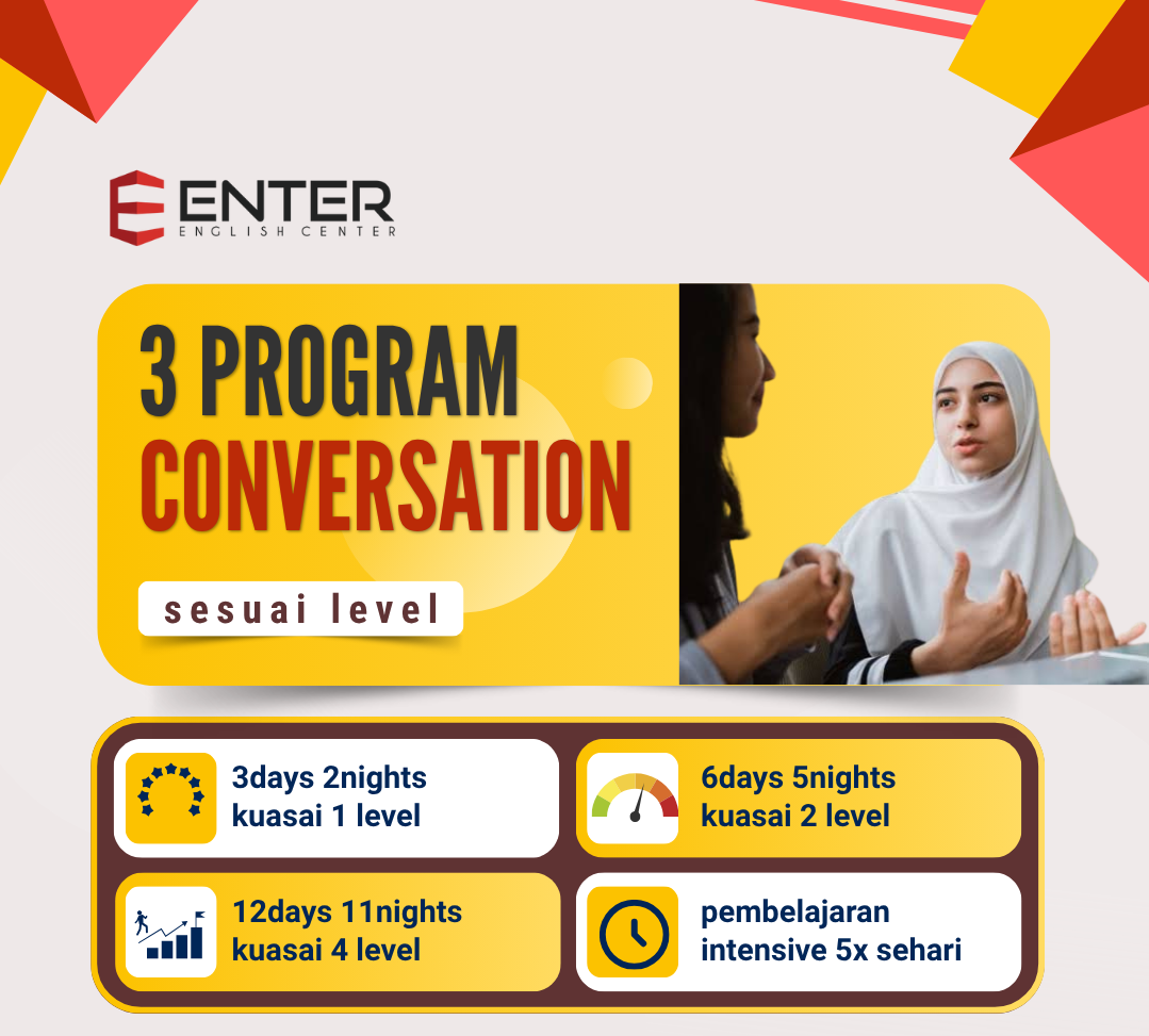 Mau belajar bahasa Inggris yang seru, intensif, dan penuh manfaat? Di sini tempatnya! Kamu bisa pilih program sesuai kebutuhanmu—mulai dari 3 hari untuk 1 level, 1 minggu untuk 2 level, atau 2 minggu untuk 4 level. Dalam sehari, kamu akan belajar sampai 5 kali, jadi kemampuan speaking kamu bakal naik pesat!